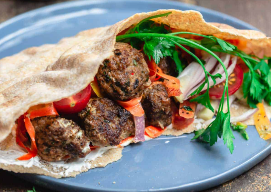 meatballs in pita bread with lettuce tomato and red onion with a drizzle of
